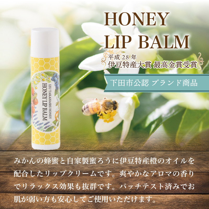 その「みかんの蜂蜜」と自家製蜜ろう、伊豆特産ダイダイのオイルを配合した、天然成分100%、パッチテスト済みのリップクリーム「HONEY LIP BALM」(5g)。