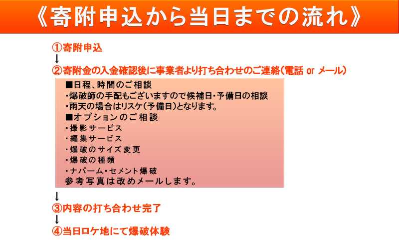 | 容量 | 爆破体験の貸切プランです。(昼/夜間) 《日程》 ・ご希望の日付 《スケジュール例》 14:00 集合・ご説明 15:00 昼の爆破2発 日没後 夜の爆破1発 ※爆破の追加可能(別途費用) 《ロケ地》 ・静岡県裾野市須山2255-39 (旧富士山資料館付近) ※旧富士山資料館にてトイレ使用可 《寄附申込から当日までの流れ》 (1)寄附申込 (2)寄附金の入金確認後に事業者より打ち合わせのご連絡(電話 or メール) ■日程、時間のご相談 ・爆破師の手配もございますので候補日・予備日の相談 ・雨天の場合はリスケ(予備日)となります。 ■オプションのご相談 ・撮影サービス ・編集サービス ・爆破のサイズ変更 ・爆破の種類 ・ナパーム・セメント爆破 参考写真は改めメールします。 (3)内容の打ち合わせ完了 (4)当日ロケ地にて爆破体験 《お問い合わせ》 ご不明点は、お電話でも対応いたします。 コスナビ代表: 出口 悦寛(090-3007-5836) 【重要】楽天からお申し込みのお客様へ 楽天経由のお申し込みでは、メールアドレスが暗号化され、弊社で確認できません。 お手数ですが、お申し込み後、必ず「cosnavi2012@gmail.com」まで一度ご連絡ください。 ※ご連絡がない場合、お電話でアドレス確認のご連絡を差し上げる場合がございます。 |