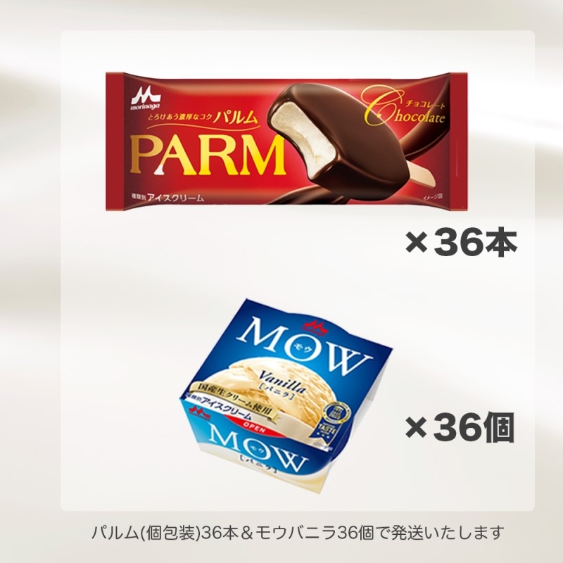 | 容量 | 【PARM チョコレート(マルチ)】90ml×36本 乳製品(国内製造、ニュージーランド製造、その他)、準チョコレート、砂糖、水あめ、加糖卵黄(卵黄、砂糖)/乳化剤、香料、安定剤(増粘多糖類)、(一部に卵・乳成分・大豆を含む) 【MOW バニラ】140ml×36個 乳製品(国内製造、ニュージーランド製造)、水あめ、砂糖、加糖卵黄(卵黄、砂糖)、カラメルシロップ(砂糖、水あめ)/香料、(一部に卵・乳成分を含む) 原産地:裾野市 |