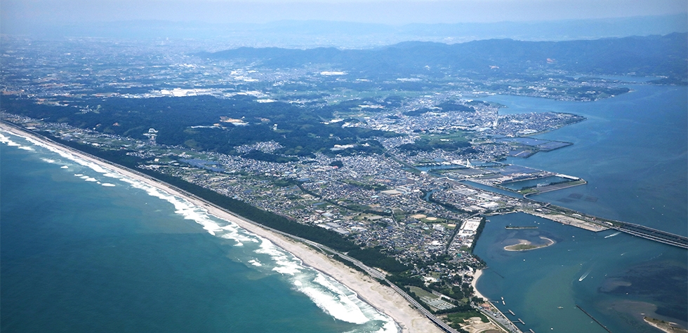 静岡県の最西端、愛知県との境に位置する湖西市。緑豊かでトレッキング・コースとしても親しまれている湖西連峰、はるか水平線をのぞむ大海原・太平洋、そして美しい水をたたえた汽水湖・浜名湖に囲まれた、自然豊かで温暖な気候の美しいまちです。本州のほぼ中央に位置するという立地条件に恵まれたことで、全国で唯一現存する関所建物の新居関跡、昔の街並みが残る白須賀宿などからも分かるとおり、古くから交通・輸送の要衝として栄え、現在も人・物・情報が盛んに往来しています。