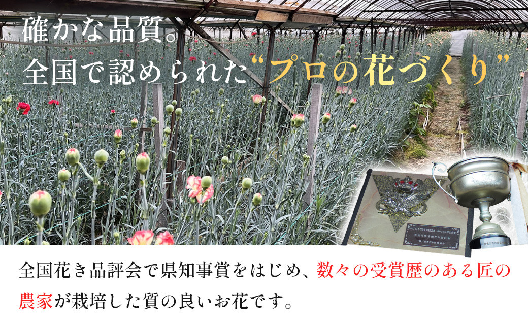 伊豆市土肥の海風が吹く街で、ご夫婦が45年間にわたり約8,000本の花を丁寧に育てています。全国花き品評会で県知事賞など多数受賞した高品質の花を、より多くの方に楽しんでいただきたいという想いでお届けします。