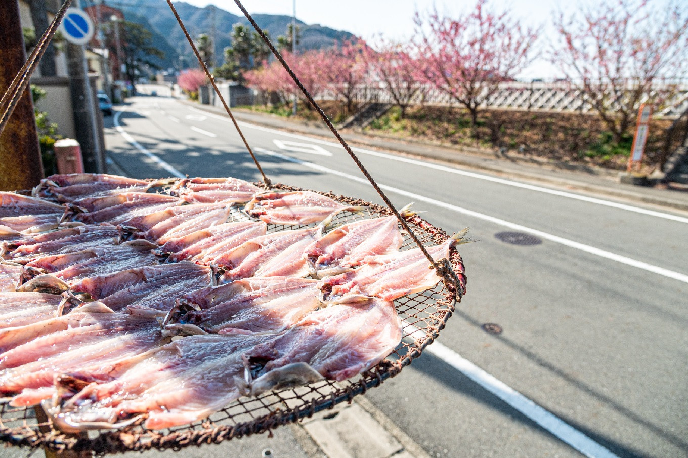土肥の潮風を存分に浴びて天日干しされるひもの。天候や風向きによって干す場所を変えている。