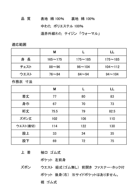 中綿 ポリエステル 100% (遠赤わた ウォーマル使用)