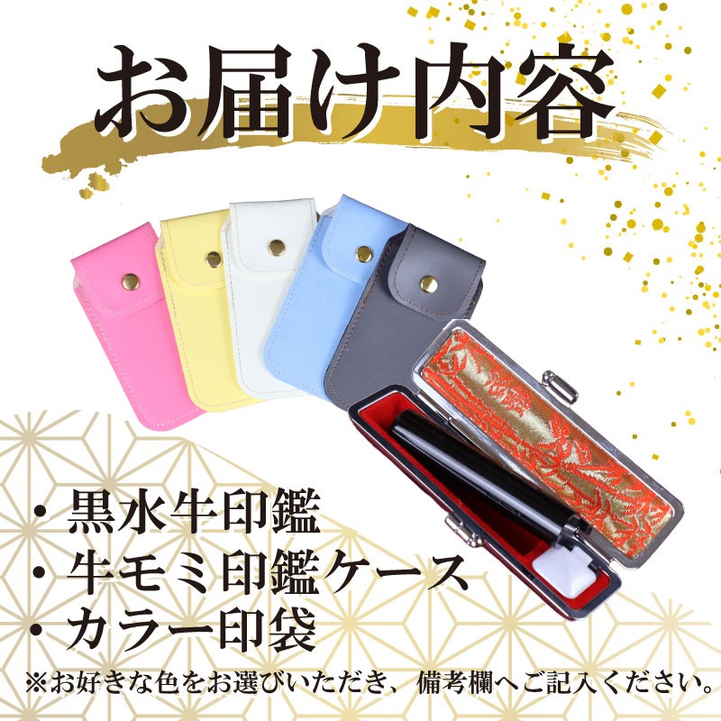 | 容量 | ・黒水牛(12mm×60mm) ・牛モミ皮印鑑ケース(黒) ・カラー印袋 × 1個(白、ピンク、水色、黄色、グレー) ※カラー印袋はお好きな色をお選びいただき、備考欄へのご記入をお願いいたします。 |