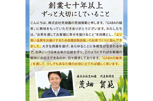 GABAとは、体内に存在する天然アミノ酸のひとつ「γ-アミノ酪酸」の略称です。甘藷、サトウキビ、トウモロコシ、馬鈴薯から抽出した注目の栄養素GABAに荒畑園の緑茶をプラスしました。お茶の成分であるカテキン、ビタミンCもたっぷり含まれているので、日常の飲料としてもオススメいたします。