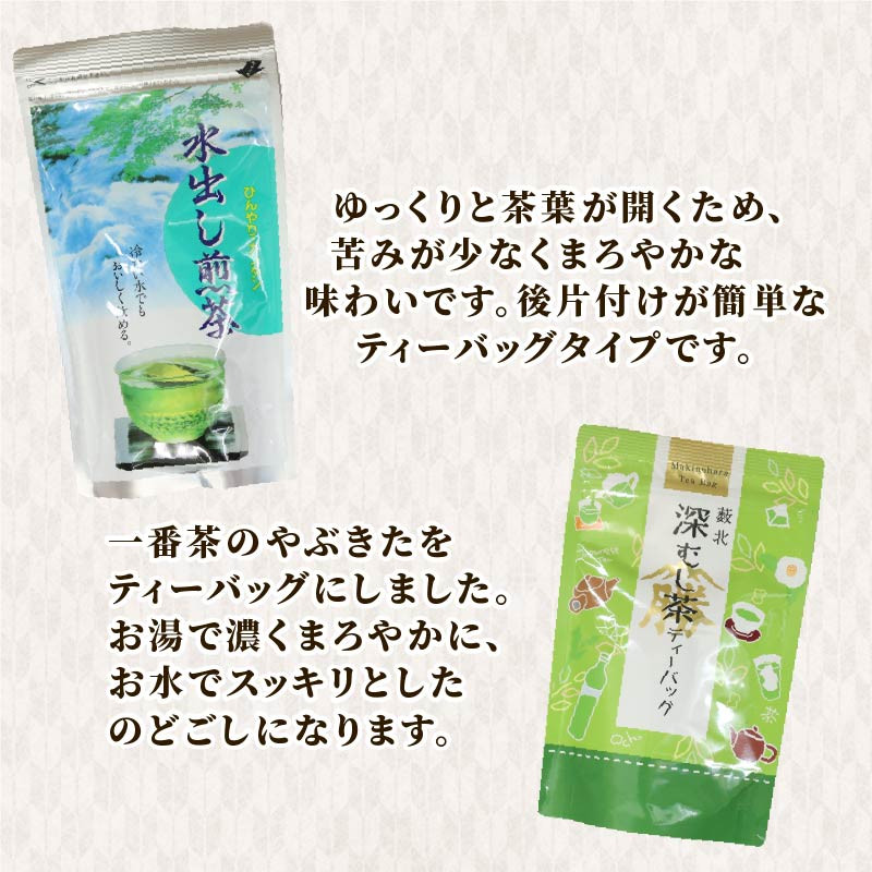 …一番茶のやぶきたをティーバッグにしました。お湯で濃くまろやかに、お水ですっきりとしたのどごしになります。