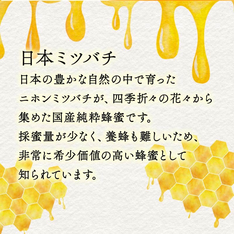 日本の豊かな自然の中で育ったニホンミツバチが、四季折々の花々から集めた国産純粋蜂蜜です。