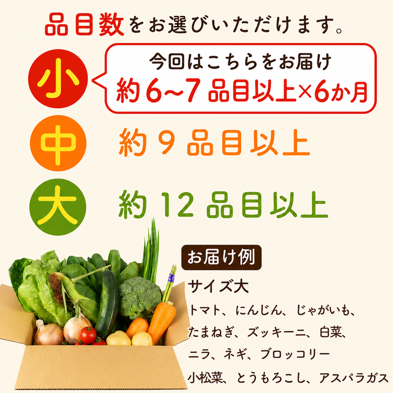 | 容量 | 季節の野菜セット 6~7品目×6か月 |