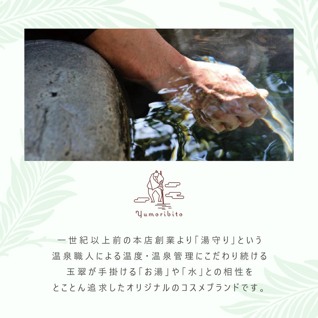 Yumoribitoは、伊豆の温泉旅館、玉翠が手掛ける「お湯」や「水」との相性を追求した、オリジナルのコスメブランドです。玉翠の温泉への情熱を象徴するその「湯守り」と、「温泉で美しさを守る人」、これらを合わせ、「湯守美人(Yumori bito)」と命名いたしました。