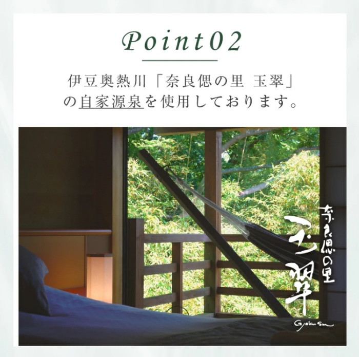 玉翠は、20世紀初頭、静岡県伊豆半島の伊豆熱川温泉にて産声を上げました。現在は、奥熱川の「奈良偲の里 玉翠」と伊豆高原の「大室の杜 玉翠」、二つの宿泊施設を運営しております。自家源泉を数か所保有しており、その温泉を使用し、Yumoribitoのいくつかの商品を製造しております。