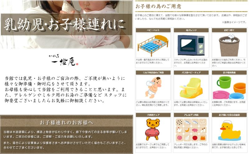 当館では乳児・お子様のご宿泊の際、ご不便が無いように様々な御準備・御対応をさせて頂きます。