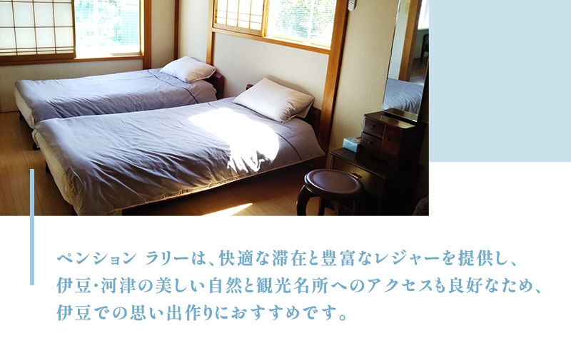 ペンションラリーは、快適な滞在と豊富なレジャーを提供し、伊豆・河津の美しい自然と観光名所へのアクセスも良好なため、伊豆での思い出作りにおすすめの宿泊先です。