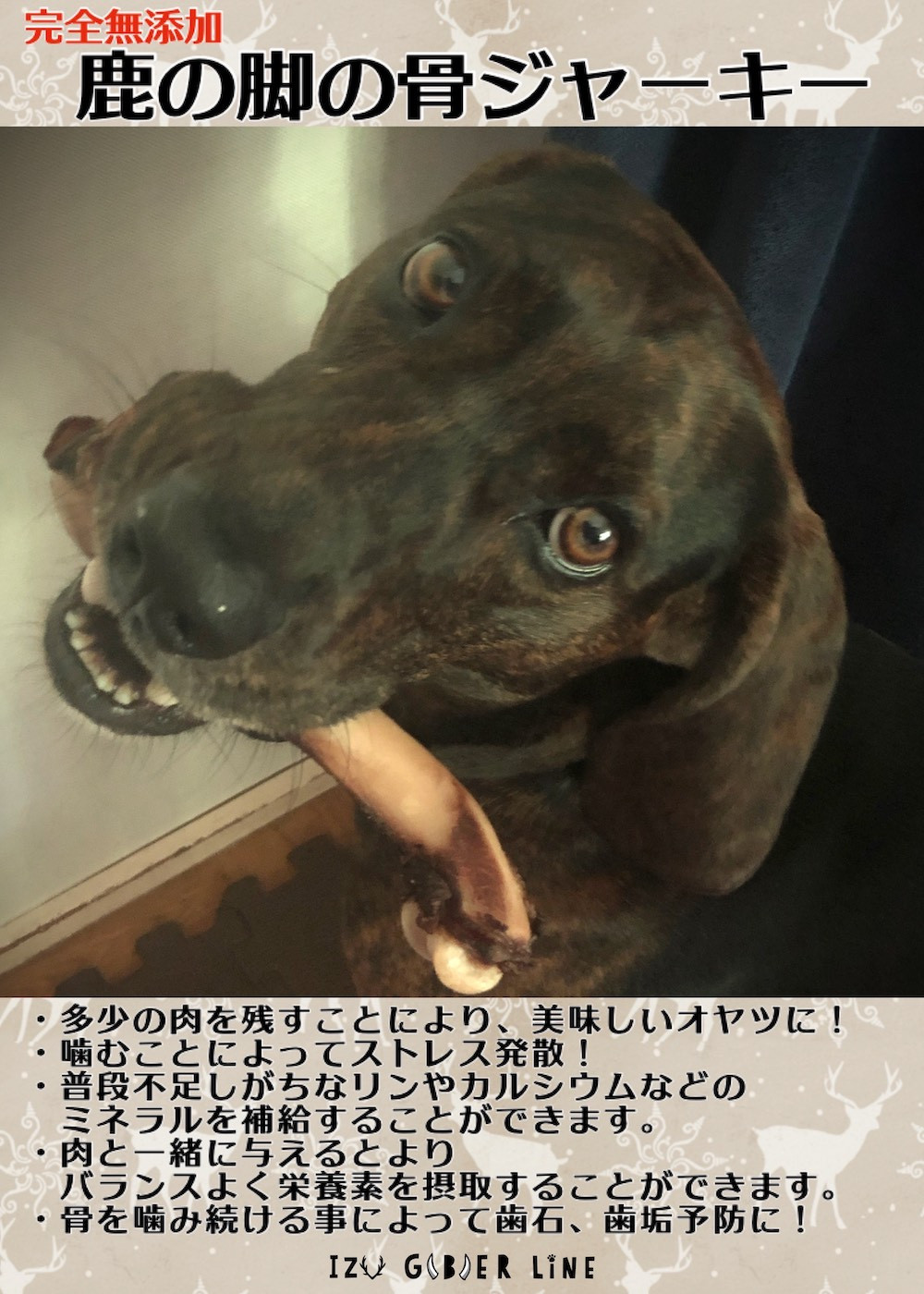 | 容量 | 鹿肉ジャーキー50g×1・鹿の足の骨×1 |