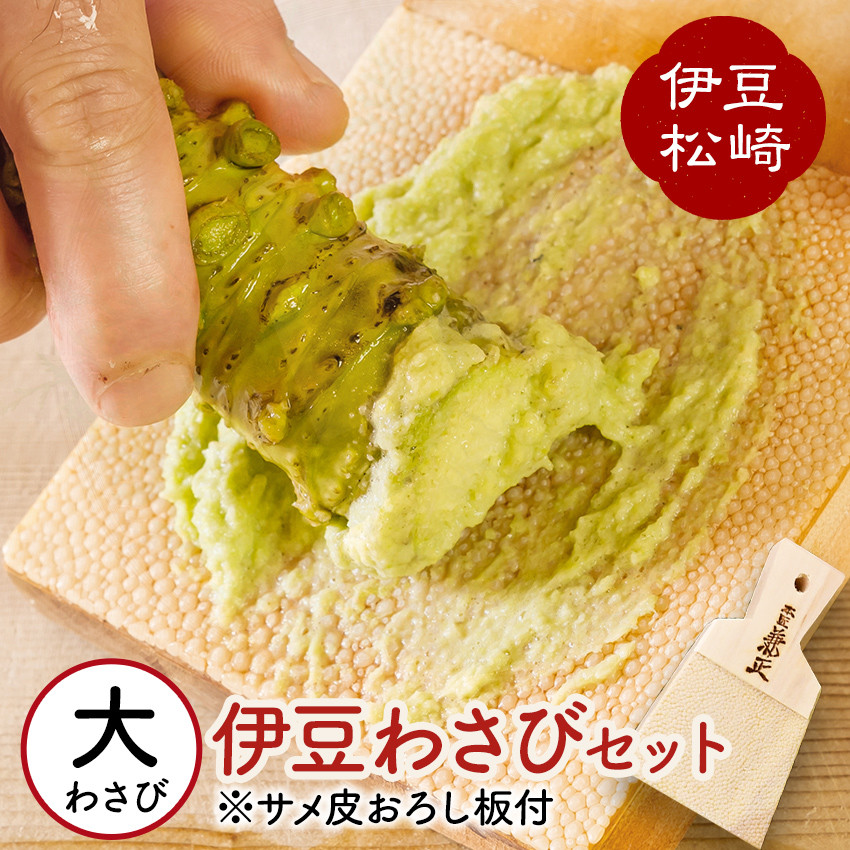 【提供時期】通年 松崎のわさび専門メーカー『わさびのわたなべ』がお届けします。 伊豆天城の生わさび!自社のわさび沢から収穫されたわさびを厳選し、新鮮なうちにクール便にて出荷します。風味がよくてツーンとくる辛みが生きてます。お刺身、お寿司、おそばはもちろん焼酎に入れてもおいしいですよ。 【サメ皮おろし板】 最高級本鮫皮を厳選し、丹念に職人がつくりあげました。きめ細かくすりおろすことができ、わさびの辛みがいっそうひきたちます。