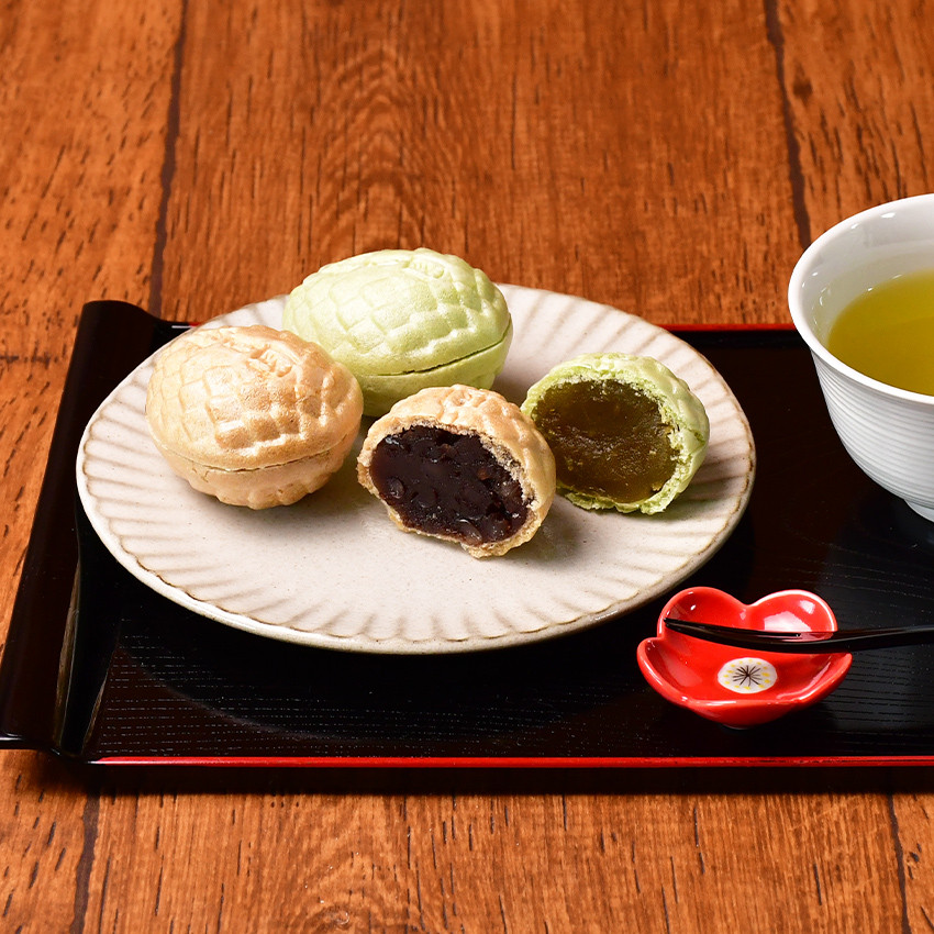 【提供時期】通年 若松かさ、老松かさの2種類にわけ、挽茶色に青えんどう豆の小豆餡を、焦茶色には小豆の小倉餡を詰めて2つの味に分けた当店特製品で、特許庁より認可を得た登録の松かさ最中です。 【提供事業者】 梅月園