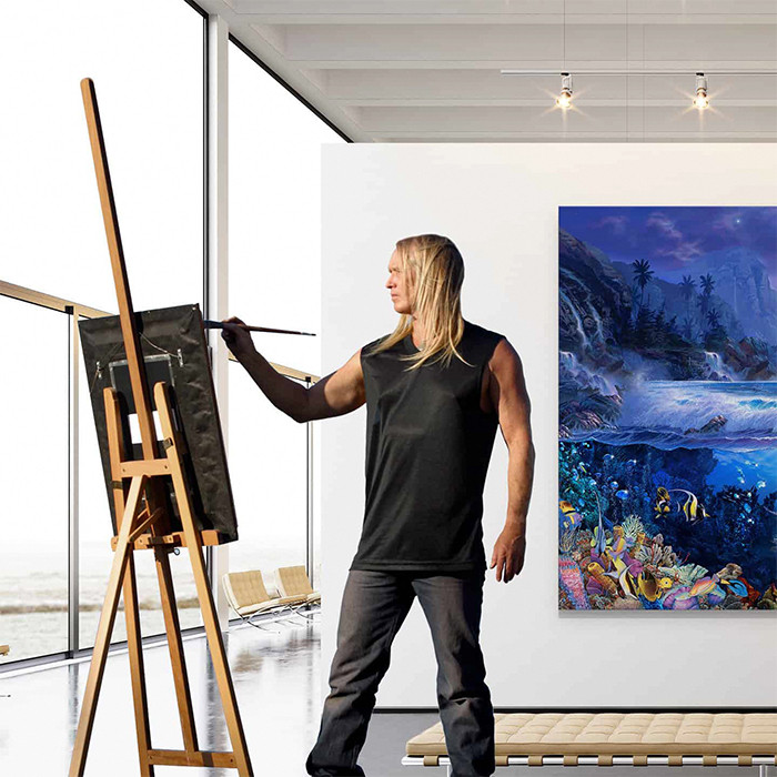 クリスチャン・ラッセンは、海中風景やイルカなどの海洋生物を主なモチーフに、南洋の自然をきらびやかな画風で描き、「マリンアート」と称され、日本でも人気の画家として知られています。