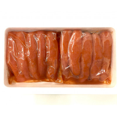 もっとも完熟した原料を、かねふく独自の明太調味ダレに68時間以上、じっくり二度漬けしました。225gずつ、4袋にしていますので、保存に便利です。袋詰めする際に特製旨だれを一緒に封入していますので、より深みの増した味わいになっています。