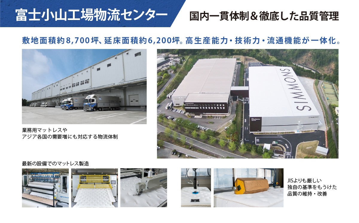1870年アメリカで創立したシモンズは1964年東京オリンピックの年、銀座に事務所を開設。当時ベッド文化がまだ普及していなかった日本で、アメリカシモンズのマットレス製造技術と信念を受け継ぎながら、日本人のためのマットレス開発と製造を始めます。富士小山工場は2009年4月に設立。高い生産能力と技術力、流通機能が一体化した小山工場は日本最大級のポケットコイルマットレス工場として大きな話題を呼びました。