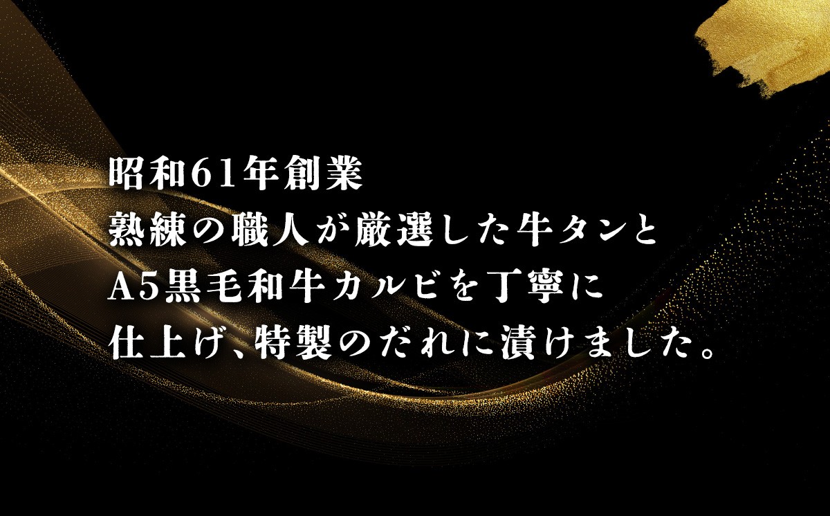 熟練の職人が厳選した牛タンとA5黒毛和牛カルビを丁寧に仕上げ、特製だれに漬けました。