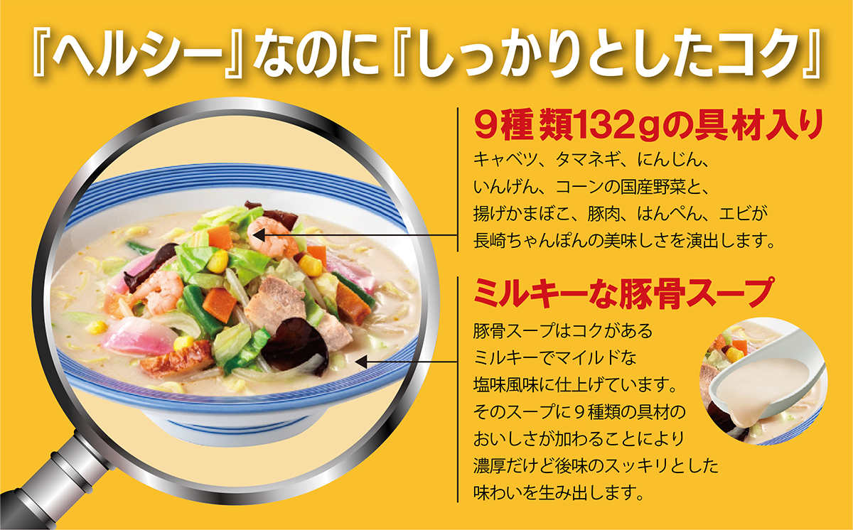 豚骨スープはコクがあるミルキーでマイルドな塩味風味に仕上げています。そのスープに9種類の具材のおいしさが加わる事により濃厚だけど後味のすっきりした味わいを生み出します。