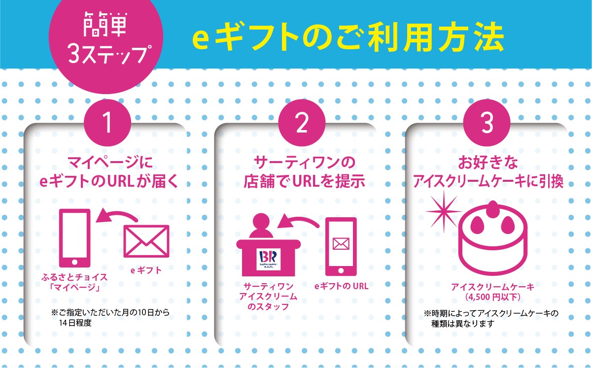 全国(※)のサーティワン アイスクリーム店舗で「サーティワン アイスクリーム アイスクリームケーキ(4,500円以下)」と引換ができるeギフトです。