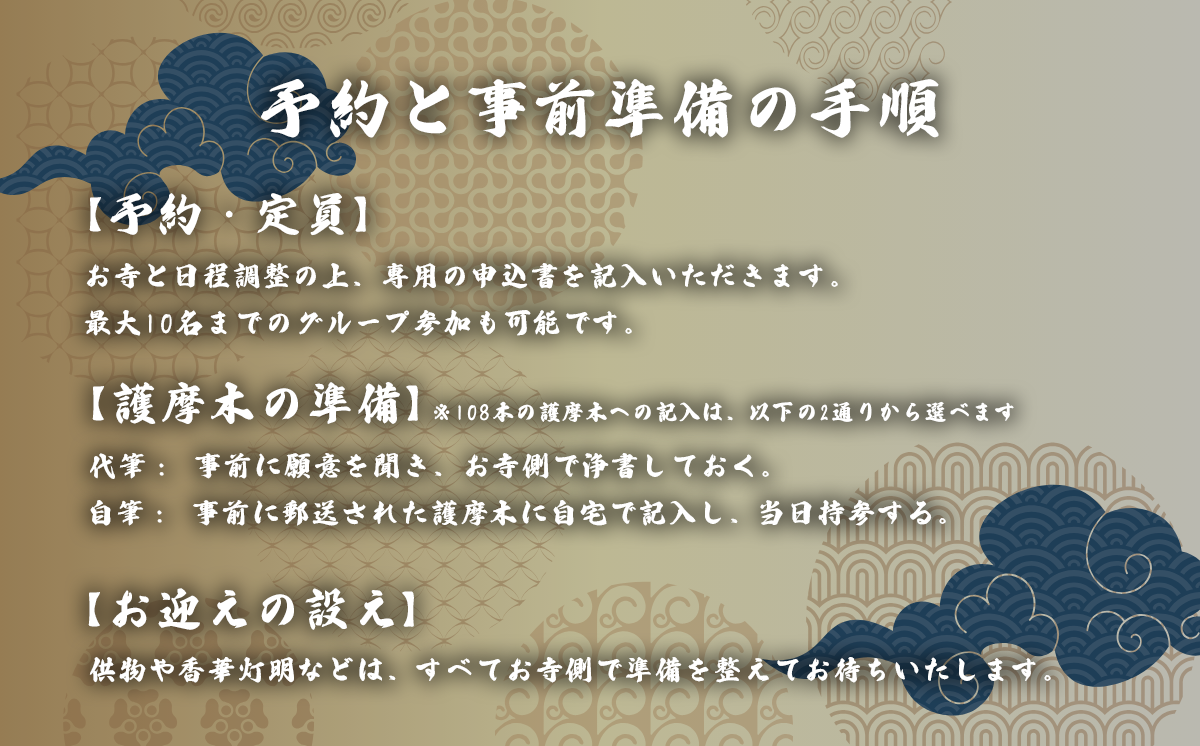 申込者との日程を調整の上、当寺へお越しいただき秘法護摩供を堂内にて修法致します。