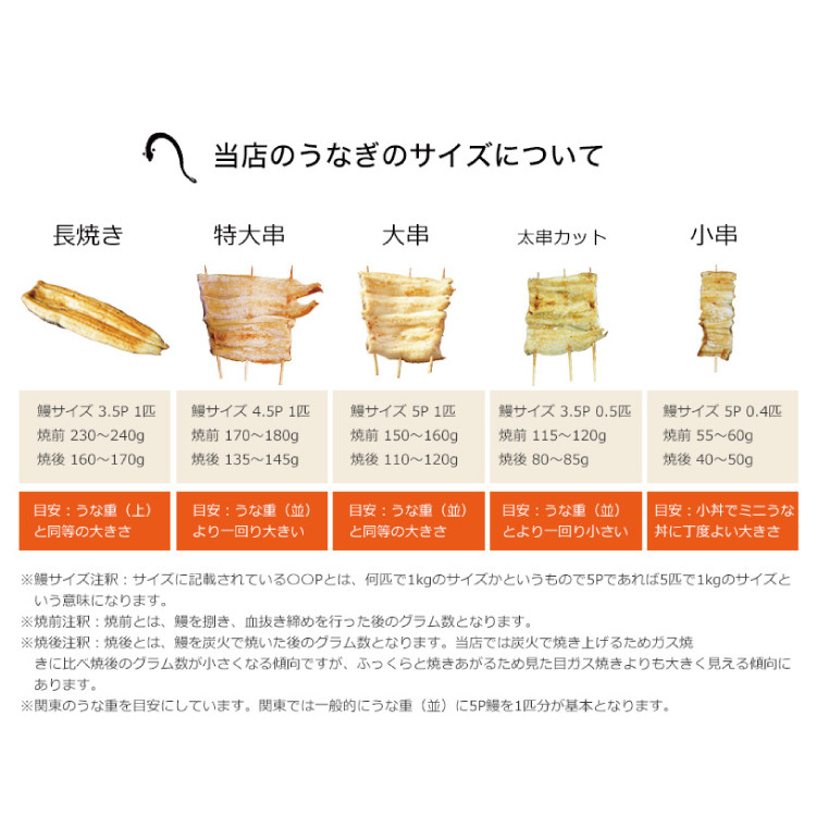 | 容量 | 内容量 ・血抜き締め国産うなぎを炭火で1本1本丁寧に手焼きした「うなぎの白焼き(大串)」[1尾約110~120g×4尾] 原産地:国内産/製造地:静岡県榛原郡吉田町/加工地:静岡県榛原郡吉田町 賞味期限:発送日から90日 ・うなぎのたれ[80ml×2本] 製造地:静岡県榛原郡吉田町 賞味期限:製造日から360日 ・山椒[0.2g×4袋] 原産地:中国・日本/製造地:東京都 賞味期限:発送日から90日 原材料・成分 ・うなぎ(国産) ・蒲焼のタレ(国産):醤油(小麦・大豆を含む 国内製造)、みりん、発酵調味料、砂糖/カラメル色素、調味料(アミノ酸等)、増粘剤(加工でん粉) ・山椒:花山椒(中国産)、国産山椒 |