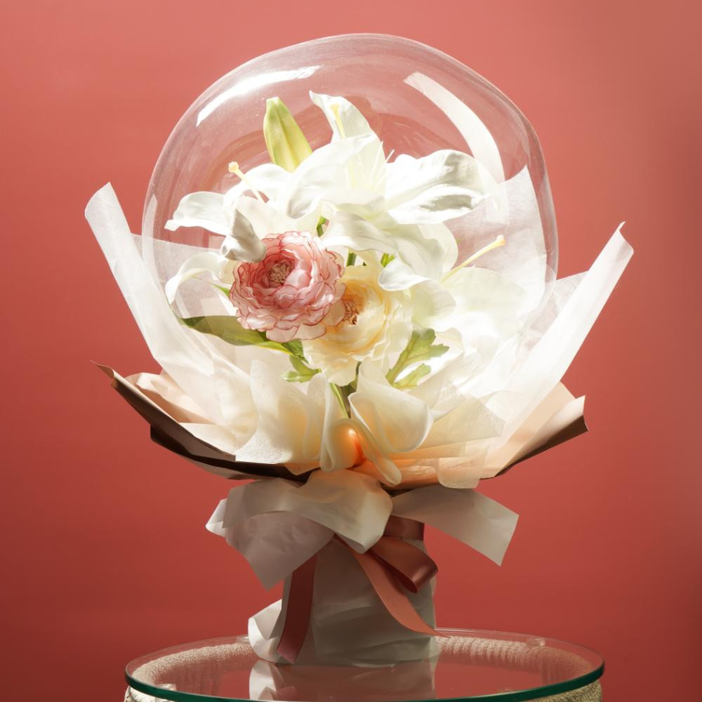 名古屋の花「ユリ」をメインに季節のお花を添えたアーティフィシャルフラワー(造花)アレンジメントのブーケを透明感抜群なバルーンでラッピングしました。華やかで清楚な気品ある姿に仕上げました。