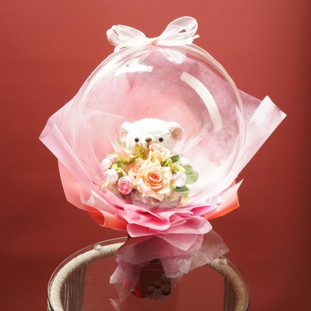 お子様のお誕生日や結婚式・ご出産祝いに好評いただいております可愛いベアぬいぐるみと、優しい色合いのローズアーティフィシャルフラワー(造花)のブーケを透明感抜群なバルーンでラッピングしました。弾力と柔らかさを備えたクリアなバルーンがベアの可愛さを更に引立てます。