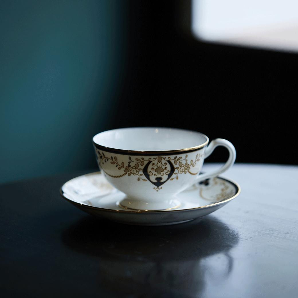 主にイギリスに向けて製造・輸出されていたとみられる食器セットのデザインをモチーフに生まれた瓔珞文のカップ&ソーサー。端正なデザインがコーヒータイムを彩ります。