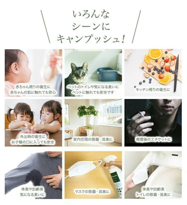 また赤ちゃんの肌やお子様の口にも安心安全な成分でできているので、ベビーグッズの除菌、ペットトイレの消臭にも安心してお使いいただけます。