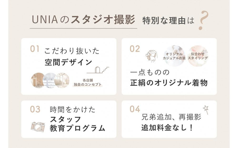 ・UNIA portraitのお着物と帯は大人用の反物から、 オリジナルで仕立てています。カジュアル衣装は、当社にてパターンから起こし、オリジナルで縫製しているものです。和装同様、既製品ではないため、他の場所では着ることはできません。「 大人も着たいこども服 」 子どもながらにシンプルでスタイリッシュ。そしてほんの少し日常から離れた特別な存在感。ありそうでないをカタチにしました。