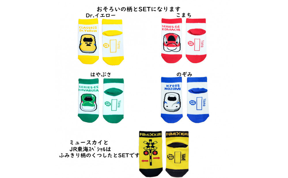 履いたり脱いだりしやすい、くるぶし丈ソックス 車輛デザインと同じ絵柄のくつしたをお届けします。