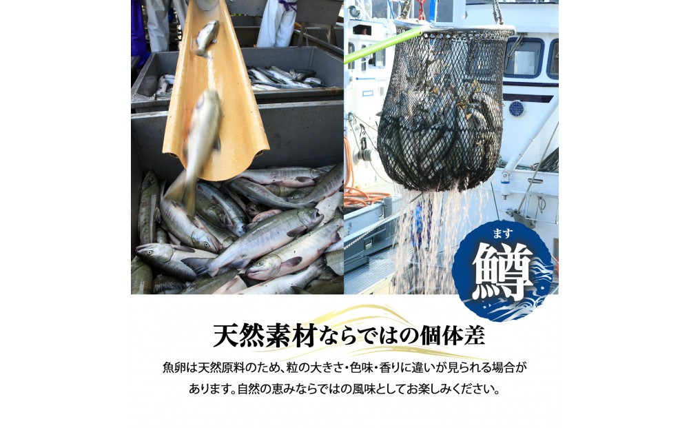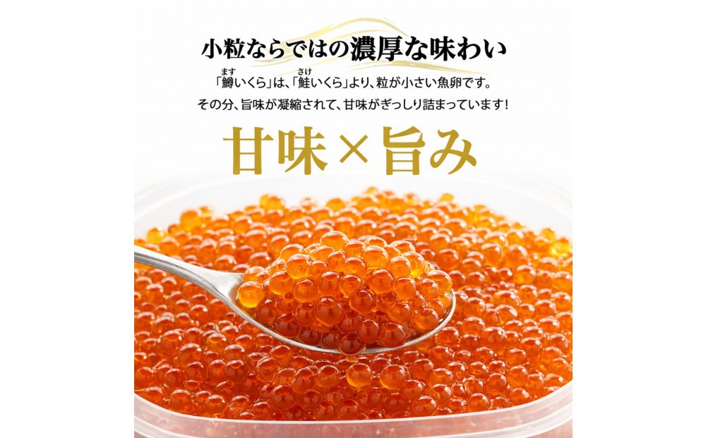 本品は鮭いくらではなく鱒卵(マスいくら)を使用。鮭いくらに比べて粒はやや小さいものの、甘味が強く、皮が薄いため口当たりがなめらかで、ご飯との相性に優れています。