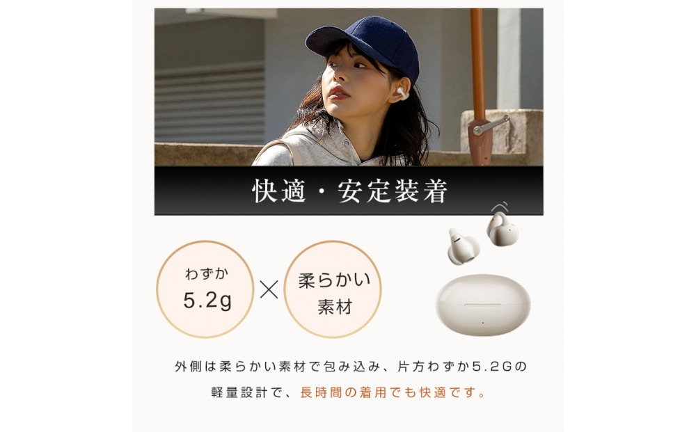 長時間の装着を考慮し、快適性を優先して設計で、イヤーカフのように、耳に挟むだけで耳を塞がなく使用できます。イヤホンを耳穴に挿入しないため、耳を覆うような圧迫感がなく、長時間使用しても耳穴が蒸れにくく快適です。