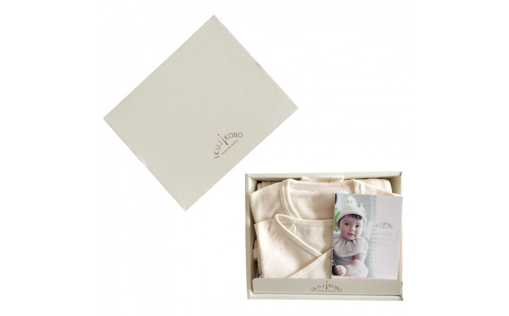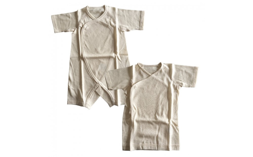 オーガニックコットンを原料にした国内生産の別注生地を使ったベビー服のセットです。無地のアイボリーのモデルですので、そのままお使いいただくことも他のデザインのモデルとの洗い替えとしてとしてお使いいただけます。