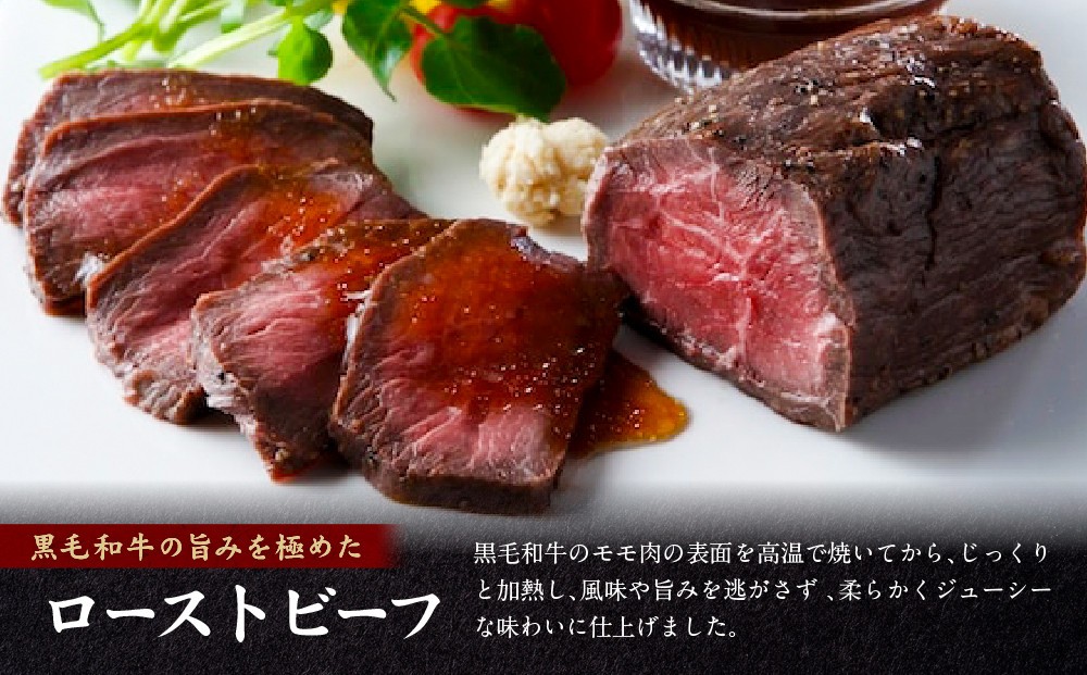 創業明治33年、お肉の専門店〈スギモト〉が選んだ黒毛和牛のモモ肉の表面を高温で焼いてから、じっくりと加熱し、風味や旨みを逃がさず 、柔らかくジューシーな味わいに仕上げました。食卓の主役としてはもちろん、ワインやビールのお供にもぴったりです。