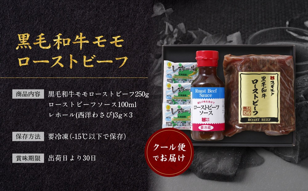 | 容量 | 黒毛和牛モモローストビーフ250g、ローストビーフソース100ml、レホール(西洋わさび)3g×3 |