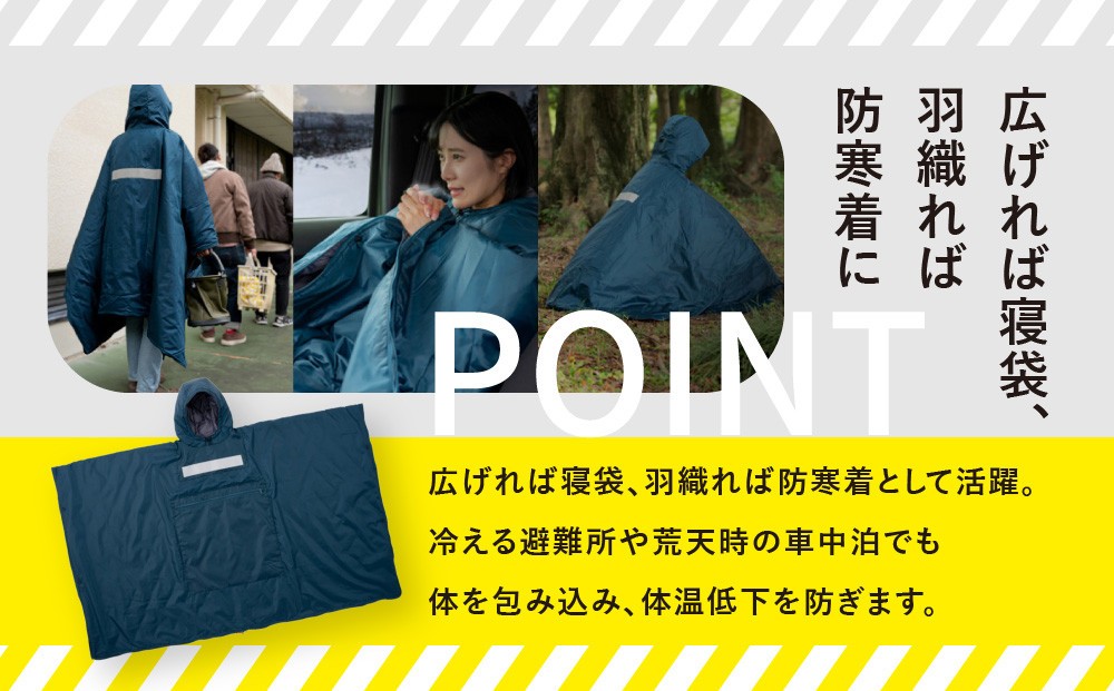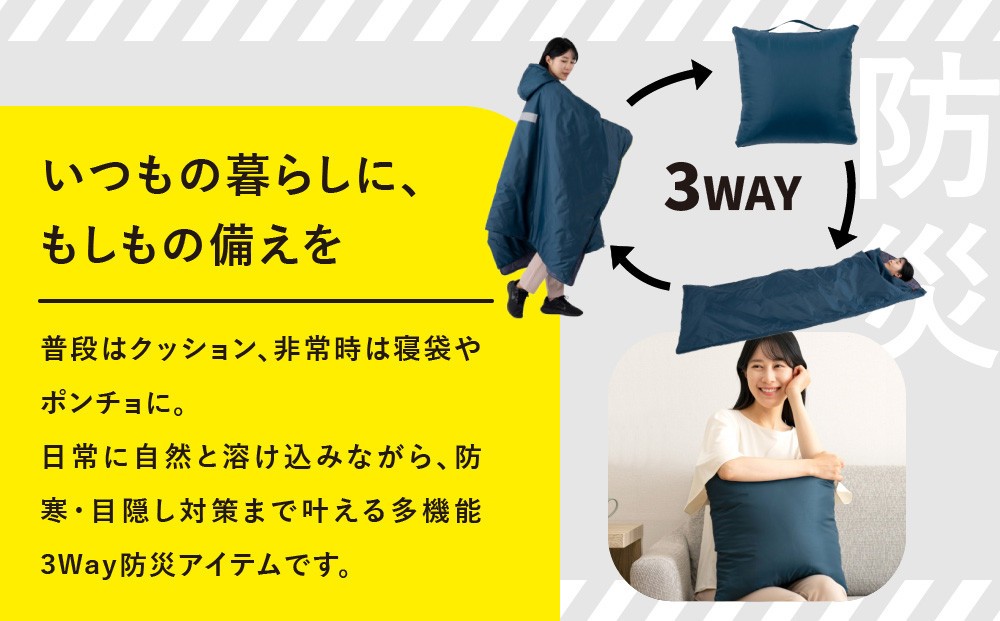 クッション、ポンチョ、寝袋の多機能3Way仕様。