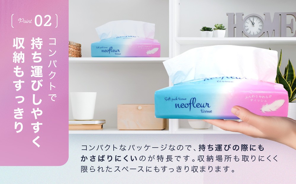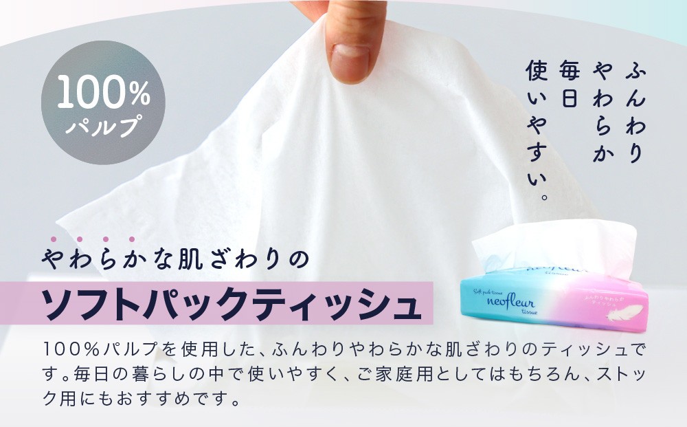 100%パルプだから、ふんわりやわらかな肌ざわりのティッシュ。