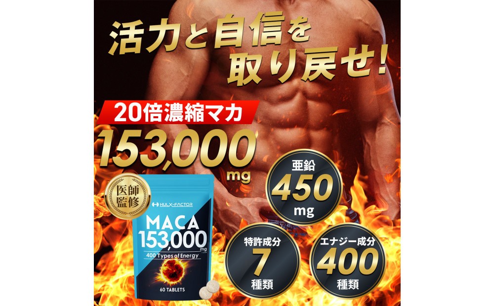 活力と健康をサポートする濃縮マカサプリ! ハルクファクター 20倍濃縮 マカ 153000mg 60粒 亜鉛 450mg 厳選400成分 特許成分 持続型 サプリ 高麗人参 牡蠣 すっぽん ビール酵母 医師監修 日本製