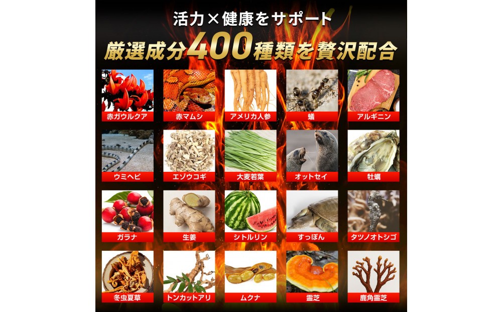 アルギニン、シトルリン、トンカットアリ、すっぽん、カロペプタイド、タツノオトシゴ、牡蠣、冬虫夏草、ビール酵母、プロポリスなど全400種類の厳選成分を配合。