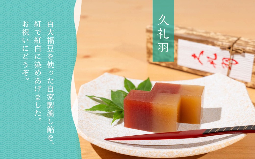 久礼羽:白大福豆を使った自家製漉し餡を、紅で紅白に染めあげました。お祝いにどうぞ。