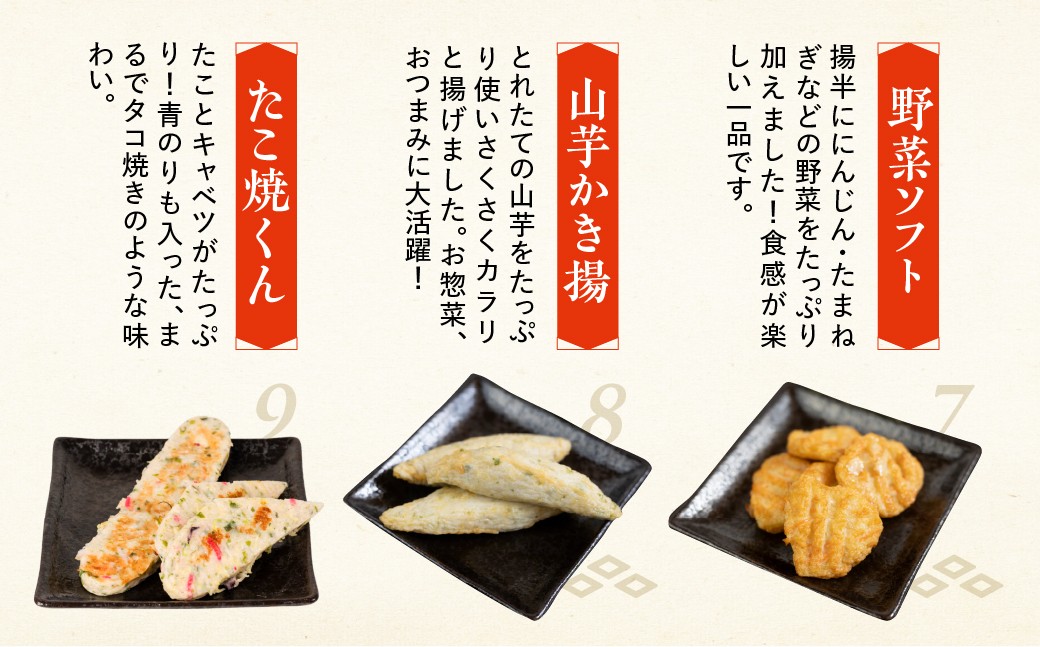 | 容量 | 特選ちくわ×3本 帆立ちくわ×3本 豆ちくわ×1袋 上揚半×1袋 生姜豆×1袋 タコそふと×2枚 野菜ソフト×1袋 山芋かき揚×1袋 たこ焼くん×2本 黒胡椒豆ちくわ×1袋 ねりチヂミいか×1枚 |