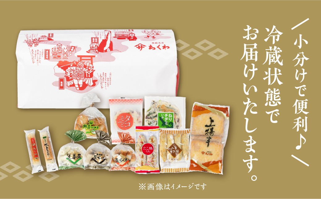 変わらないから価値がある。文政十年の創業より、素材にこだわり、技にこだわり、伝統の味を守り続けて参りました。職人が手作りで丹精込めて焼き上げたちくわと練り物の詰合せです。