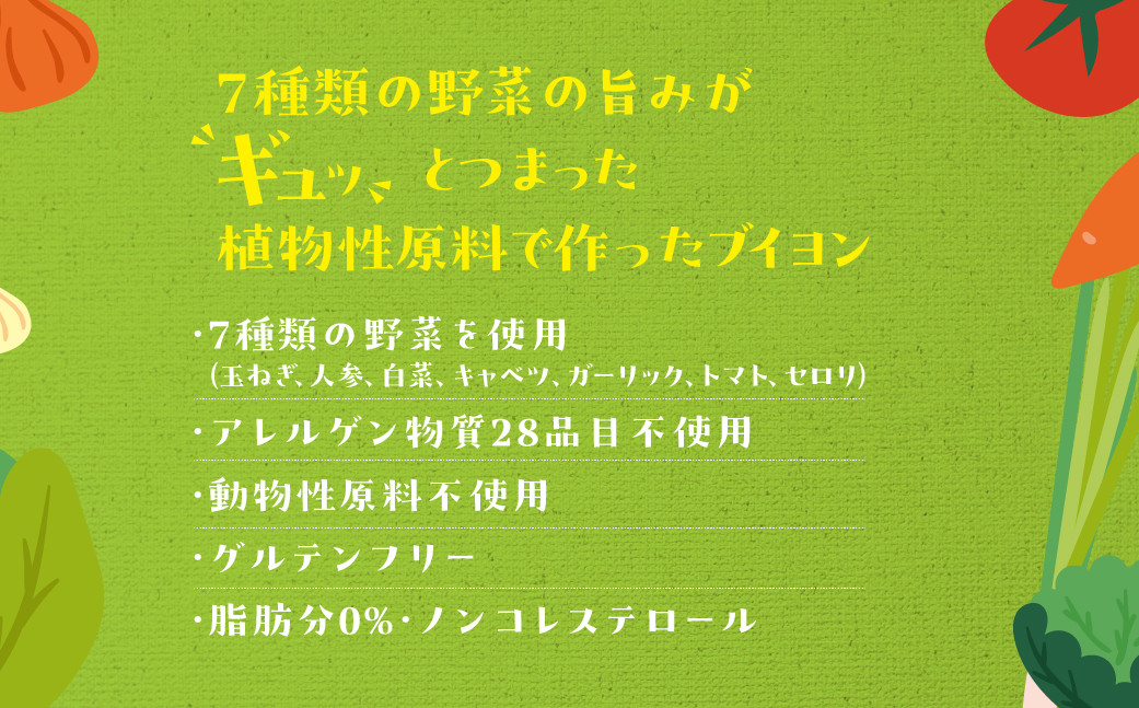 7種類の野菜の旨みがギュッとつまった植物性原料で作ったブイヨンです。