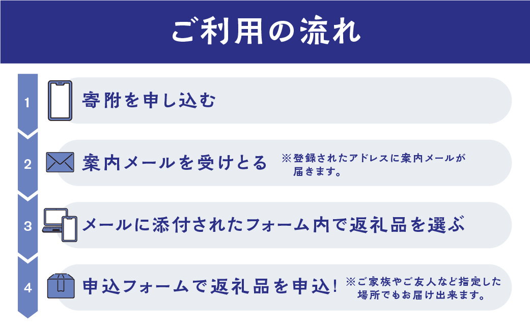 2.寄附確認後、2週間以内に返礼品申込方法を記載したメールをお送りいたします。