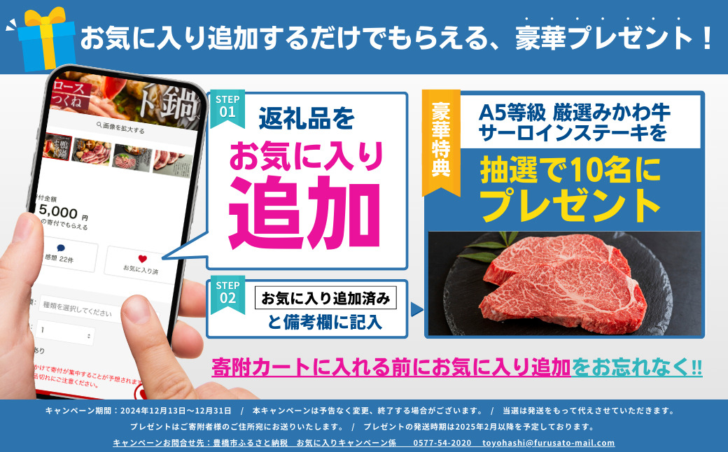 ※返礼品申込方法についてはメールにてご案内いたします。メールの設定状況等により受信ができない、迷惑メールフォルダに届いている場合がございます。