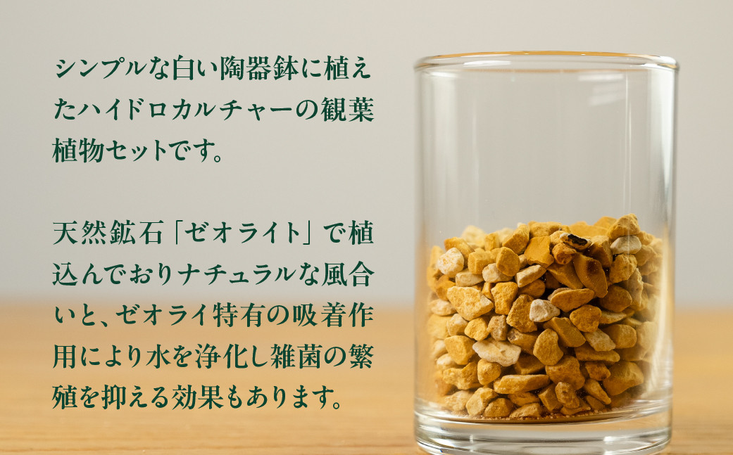 シンプルな白い陶器鉢に植えたハイドロカルチャーの観葉植物セットです。水位計つきで水の管理が簡単。