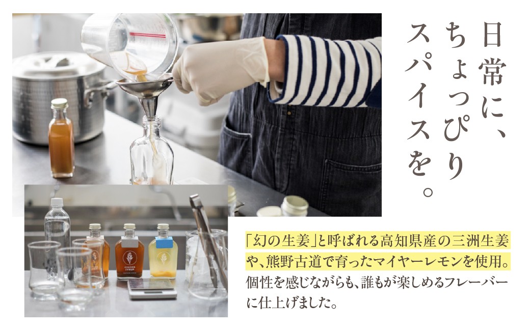 愛知県豊橋の水上ビルと言われる古い問屋街にあるクラフトシロップ製造所”TEMTASOBI GINGER”の基本となる3種類のジンジャーシロップを組み合わせたセットです。
